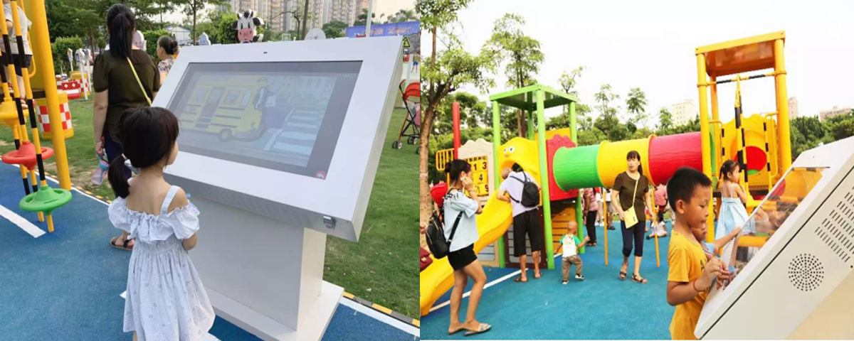 此外,乐园还精心设计了两块户外触摸屏,儿童打开户外触摸屏,就可以查阅各种交通安全知识,观看各种交通宣传案例。