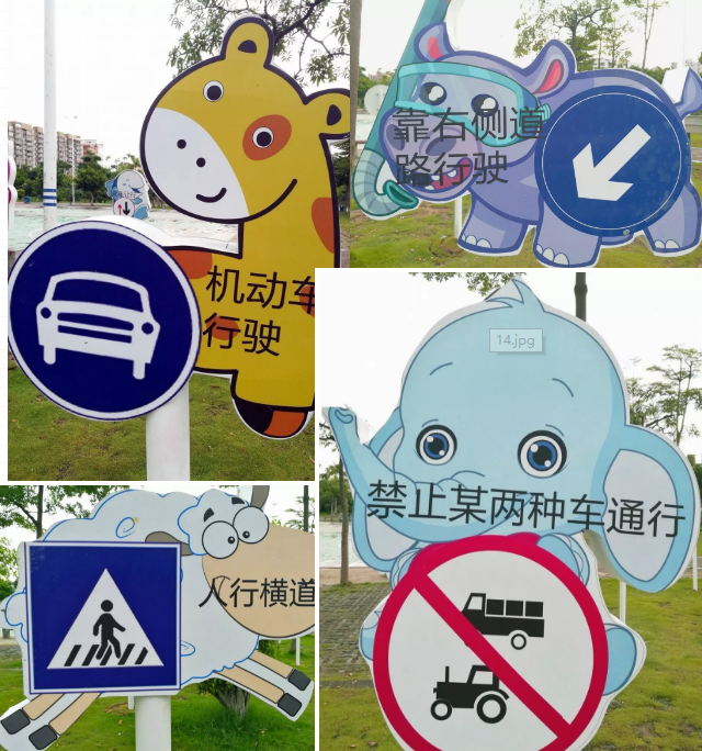 并且乐园内还有66块几乎囊括了所有常见的交通标识和说明的牌子,每一块标识牌的图像都做成卡通造型,内容也都不一样,非常引人注目。
